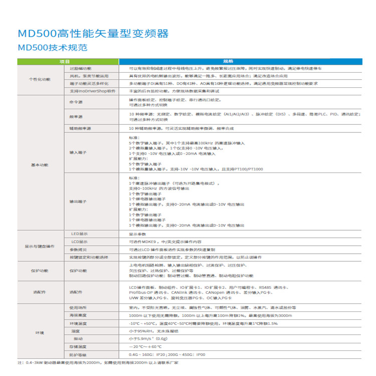 匯川變頻器MD500是匯川技術匯集了矢量變頻技術的高性能變頻器,憑借高性能的電流矢量技術,可輕松驅動感應電動機。MD500 采用高性能、高品質、高功率密度設計,在易用性、可維護性、環保性、安裝空間和設計標準等方面有顯著提升,可進一步優化用戶的使用體驗。